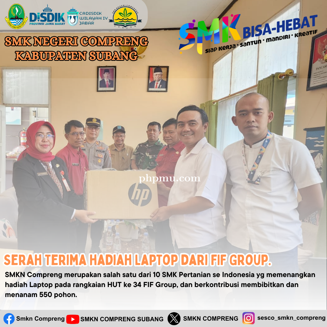 SMKN Compreng merupakan salah satu dari 10 SMK Pertanian se Indonesia yg memenangkan hadiah Laptop pada rangkaian HUT ke 34 FIF Group, dan berkontribusi membibitkan dan menanam 550 . . . 0